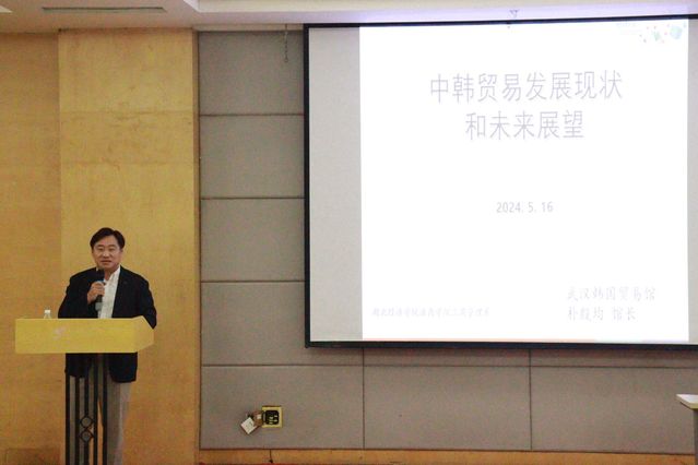 本网讯(通讯员 黄子豪)5月16日上午,我院特邀大韩贸易投资公社武汉代表处首席代表朴殷均馆长,于大学生活动中心三号报告厅作“中韩经济、贸易发展现状和未来展望”专题讲座。工商管理系党总支书记赵宏亮、团总支书记金超及部分学生共计200余人参加。