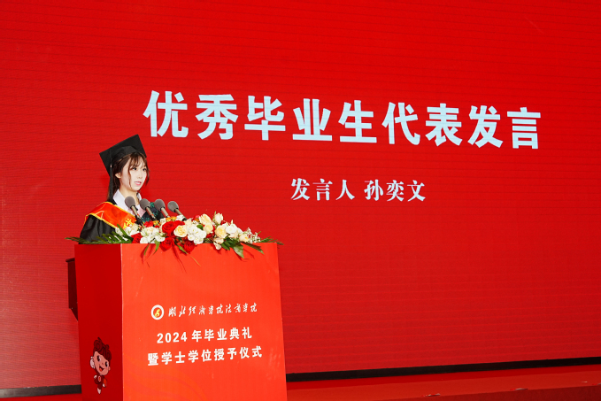 优秀毕业生代表、会计20410班孙奕文同学在发言时说道:“转眼间,我们即将挥手道别挚爱的法商,告别图书馆的书香、告别三清园的灌汤包、告别求索桥畔的樱花……也要与可亲可爱的老师们说再见。我们有幸亲历了中国共产党成立100周年的光荣时刻,有幸参与了法商学院办学20周年的庆典,有幸见证了法商学院在各类排名中的升级晋位。今天,我们共同迎来了人生新起点,感谢母校的悉心培养,感谢老师们的谆谆教诲,感谢家人朋友们的关爱和支持!”