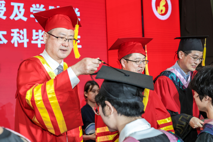 副院长、学位评定委员会副主席龚振中宣读学院《关于授予周杰等2238名毕业生学士学位的决定》,院长、院学位评定委员会主席陈昀和学院学位评定委员会委员们共同为2024届本科毕业生拨穗正冠,颁授学士学位并合影留念。
