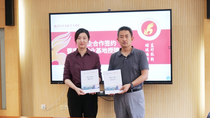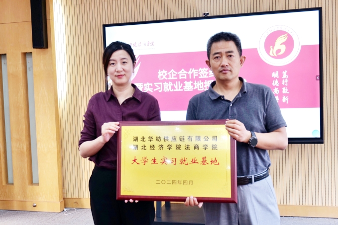 会上,龚振中和高蓓代表双方签订校企合作协议,龚振中代表学院向湖北华纺供应链有限公司授予“大学生实习就业基地”,同时聘请郭中强为我院企业导师。