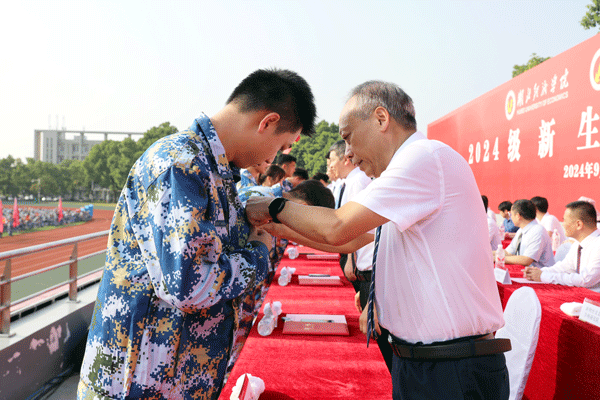 院党委书记邓志华为新生代表佩戴校徽