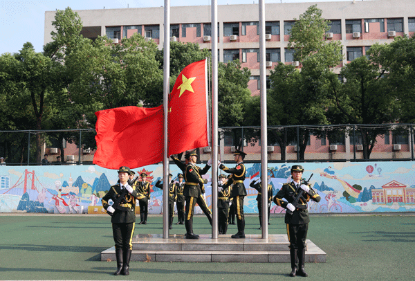 典礼伊始,举行升国旗仪式。全体师生起立,面向国旗行注目礼、奏唱国歌。升旗仪式后,邓志华为新生代表佩戴校徽,全体新生佩戴校徽。