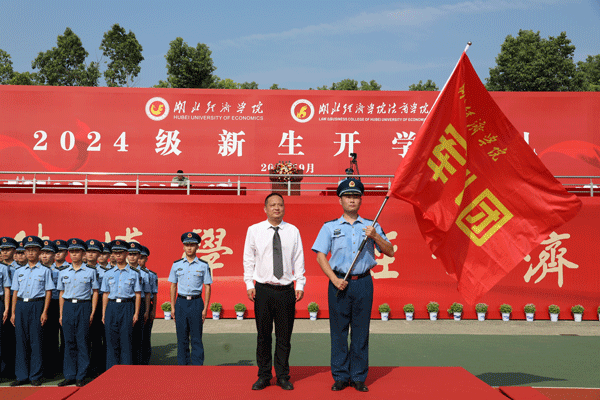 湖北经济学院党委常委、副校长付宏教授为军训团授旗,军训团团长赵兰川接旗。