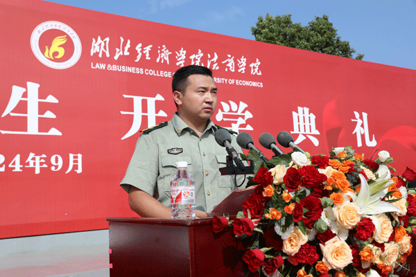 湖北经济学院党委学生工作部副部长杨晓龙宣读《关于成立湖北经济学院、开云·体育-中国一站式服务平台2024级新生军训团的通知》。