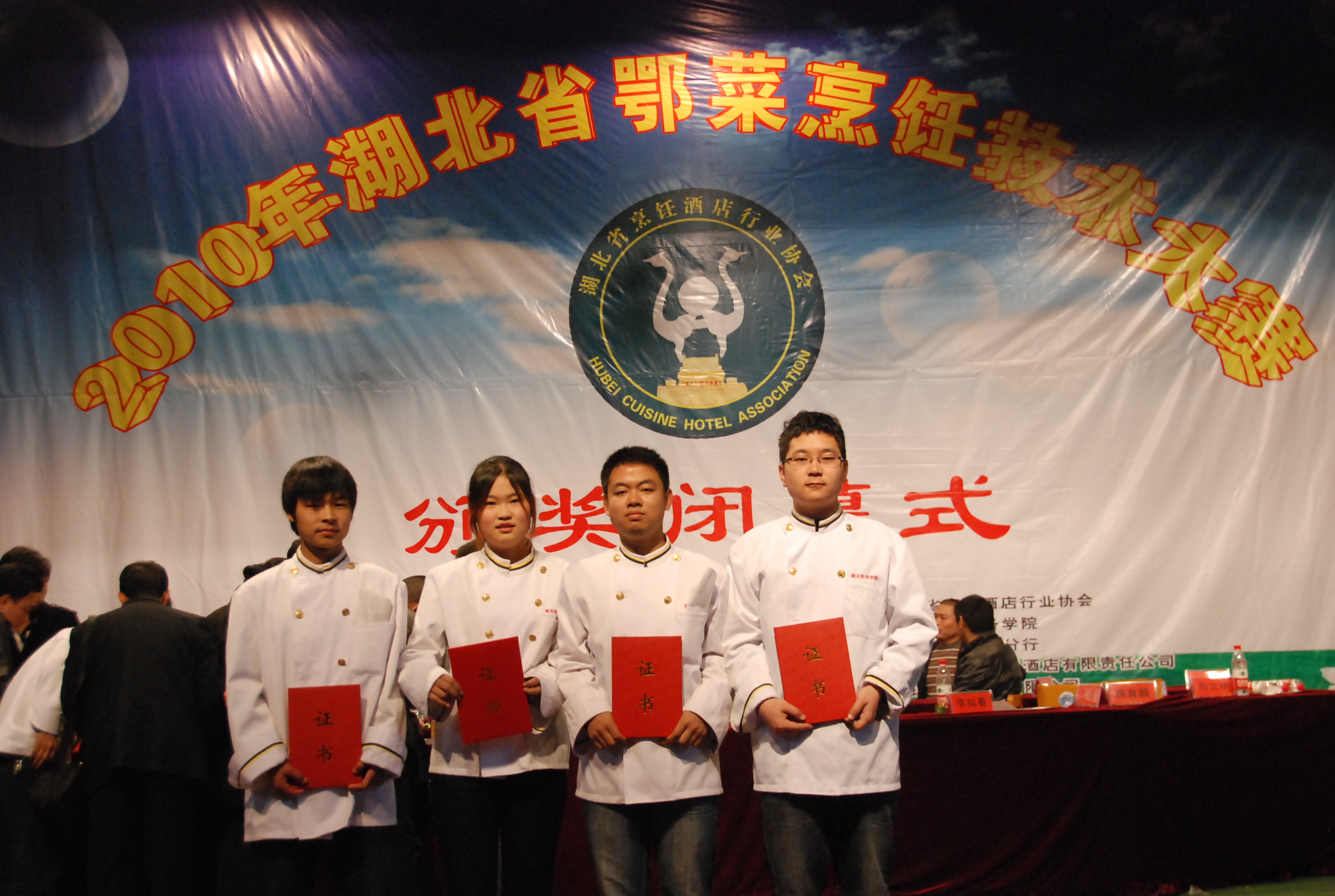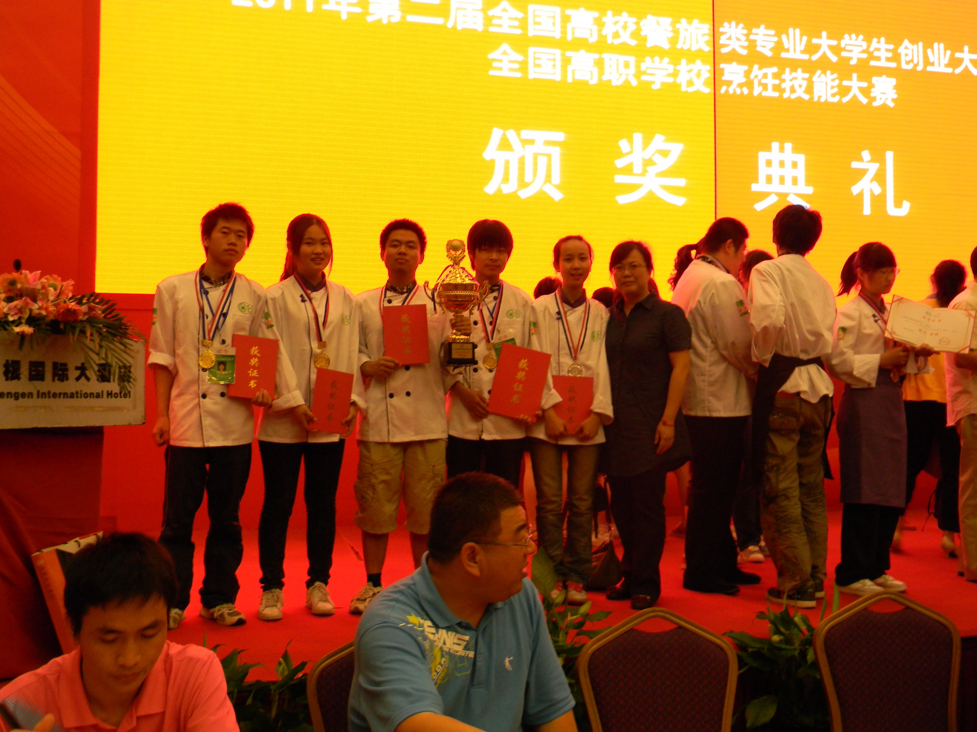 烹饪09301班秦峰、吴振、徐?、李杰4位学生参加“湖北省鄂菜烹饪技能大赛”,获金奖