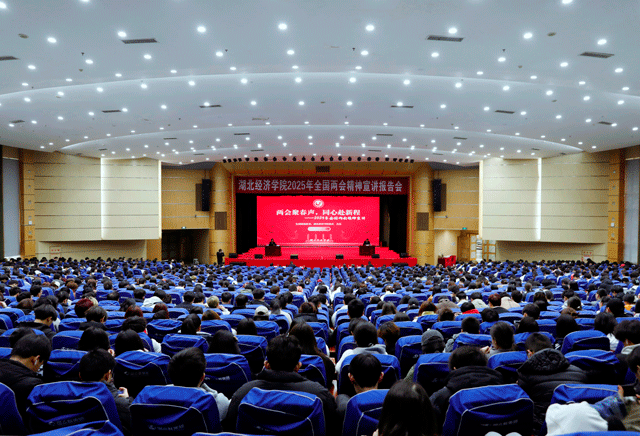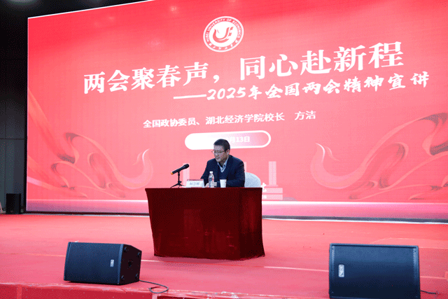 本网讯 3月13日,湖北经济学院在大学生活动中心一号报告厅召开2025年全国两会精神宣讲报告会。全国政协委员、民建湖北省副主委、湖北经济学院校长方洁作宣讲报告。法商学院全体院领导,全体中层干部、民主党派教师代表、全体辅导员以及学生代表参加。报告会由湖北经济学院党委常委、副校长、法商学院董事长何慧刚主持。