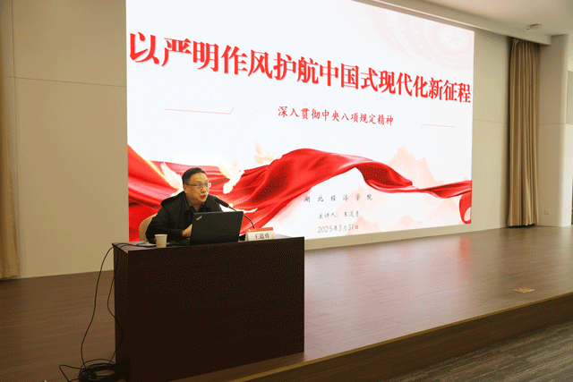 本网讯 3月31日,湖北经济学院深入贯彻中央八项规定精神学习教育读书班专题辅导报告会暨结业式在学术会议中心二号报告厅举行。湖北党员生活杂志社党建理论部主任王道勇作《以严明作风建设护航中国式现代化新征程》专题报告。学院全体院领导、全体中层干部参加会议。湖北经济学院党委书记高义勇主持并讲话。
