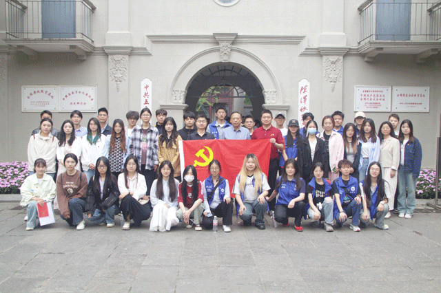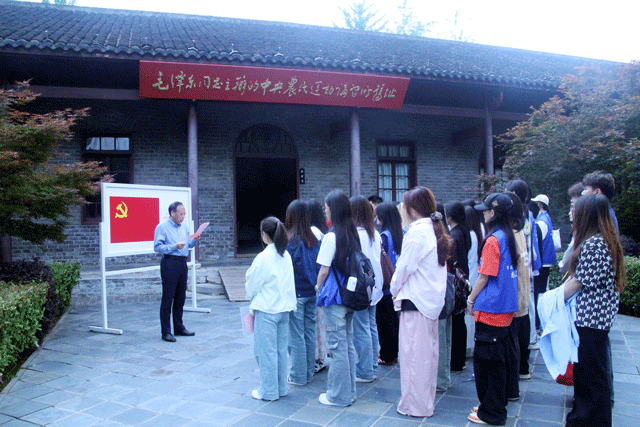 在周恩来总理题词的“毛泽东同志主办的中央农民运动讲习所旧址”门匾下,信息管理与工程系学生第二党支部书记吴丹峰带领全体师生党员庄严地举起右拳,重温入党誓词,表达为共产主义奋斗终身的决心。