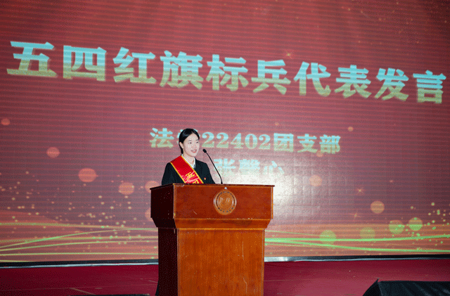 五四红旗标兵获得者、法学22402张馨心作为获奖学生代表发言讲述了她在法商的成长故事,分享了大学期间习的勇气、坚持奉献三门必修课,她号召广大青年学子以勇于创新、敢于坚持、乐于奉献的精神,做最好的自己。