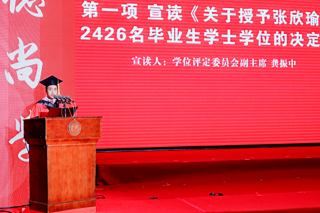 副院长、学位评定委员会副主席龚振中教授宣读《关于授予张欣瑜等2426名毕业生学士学位的决定》
