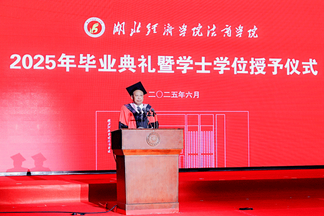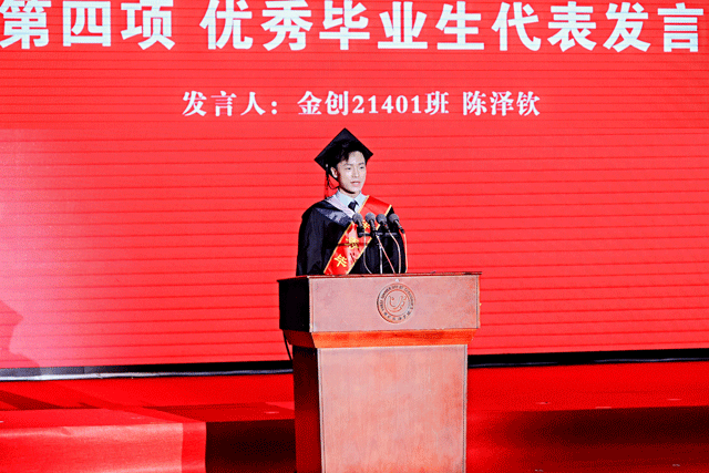 优秀毕业生代表金创21401班陈泽钦发言,他深情表白:“当我们走出校门,母校的校训永远是我们的精神灯塔,“明德尚学”让我们保持思想的高度,“笃行致新”让我们拥有行动的力量,我们将带着法商烙印,把个人理想融入国家发展的洪流,在时代的画布上书写属于这代人的青春诗行。”