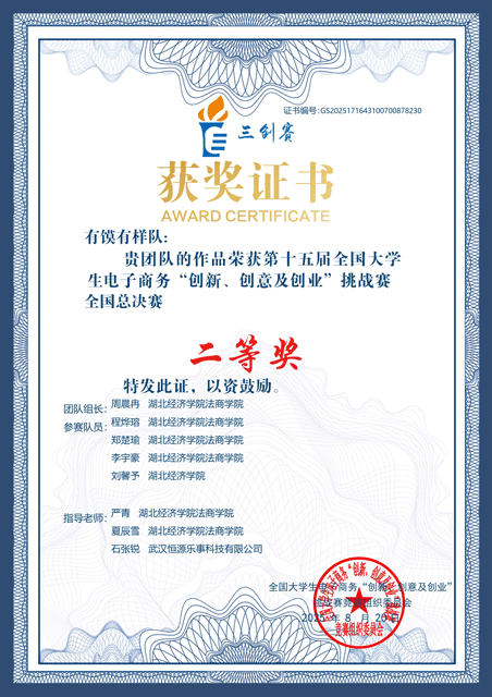 本网讯(通讯员 吴天宇 王津隆)近日,第十五届全国大学生电子商务“创新、创意及创业”挑战赛全国总决赛在贵阳贵安新区花溪大学城贵阳人文科技学院圆满落幕。在我院信息管理与工程系专职教师严青、辅导员夏辰雪、企业导师石张锐的悉心指导下,“有馍有样”学生团队获常规赛赛道国家级二等奖。