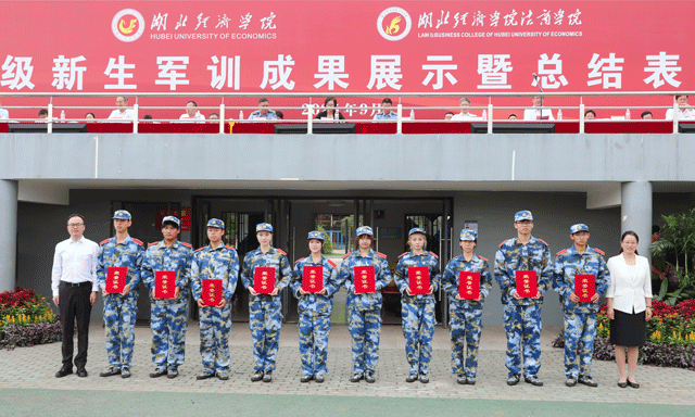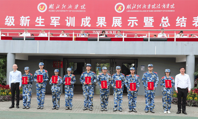 湖北经济学院党委常委、副校长张国安为军训优秀教官颁发荣誉证书。湖北经济学院党委常委、纪委书记王栎、湖北经济学院党委常委、副校长张忠民为军训先进个人颁发荣誉证书。湖北经济学院党委常委许传华、张广科为军训先进集体颁发荣誉证书。