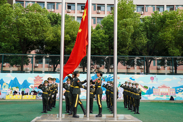 大会伊始,全体起立,面向升旗台,国旗护卫队踏着整齐的步伐入场,鲜艳的五星红旗缓缓上升,迎风招展。全场齐唱国歌,庄严肃穆。