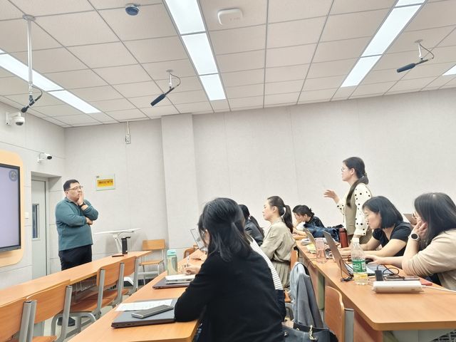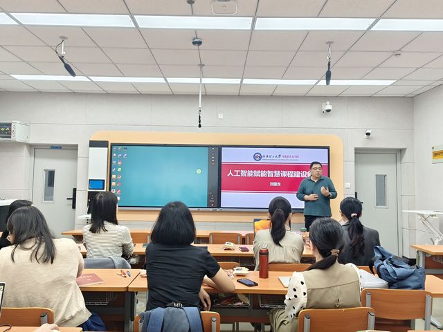 活动伊始,学院特邀武汉理工大学刘国龙教授作“人工智能赋能智慧课程建设创新工作坊”的主题报告,刘教授围绕数智时代教学的背景、赋以何能课程显成效、如何赋能驱动教学、建设一流智慧课程共四个方面展开讲解。他提出基于大语言模型的智能对话式学习,能有效提升教学互动性。建议教师们深度融合AI教学工具,坚持持续性的知识传授、能力培养和价值引领的有机统一,探索跨校协同的知识图谱共建机制,促进教学资源共享。紧接着,超星集团课程经理周锐锋介绍分享了知识图谱的创建,AI助教的应用、智慧课程优秀案例,并进入智慧课程实操和答疑环节。整个工作坊活动持续3个小时,老师们现场同步操练,积极交流,研讨氛围热烈。