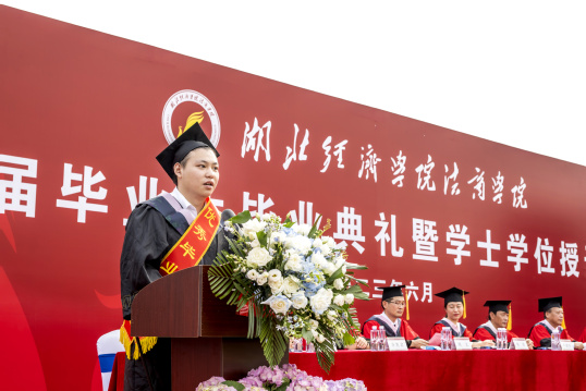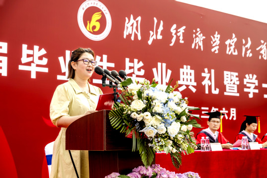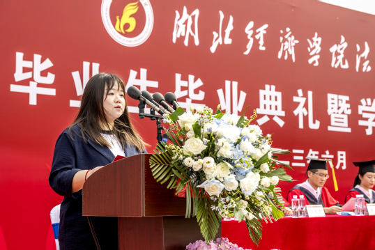 教师代表、文法系蔡洁老师在发言中指出,2023届毕业典礼,比以往更为特殊和意义深远。建校20年,对于一所学校来说,不仅是岁月的累积,更是学校的发展与成长。在这一刻,法商人要更加珍视学校的历史和传统,秉承“明德尚学、笃行致新”校训精神,坚定自己的使命和责任。希望每一位即将开始崭新人生篇章的毕业生,都能带着知识和信心,勇敢迎接未来,迎接属于自己的人生挑战和机遇。