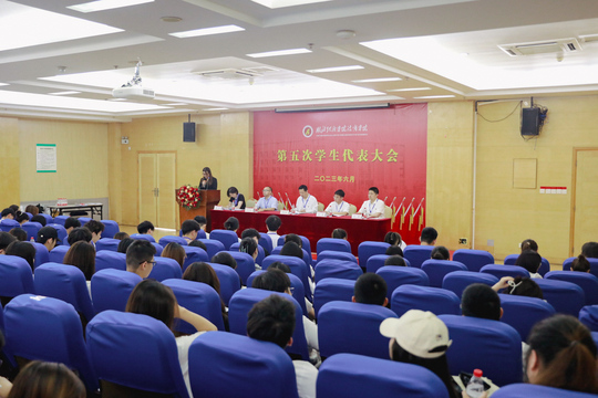 本网讯(通讯员 肖博 渠继昕 摄影 邱浩宇)6月10日,经院党委研究同意、上级组织批复,我院第五次学生代表大会在大学生活动中心三号报告厅如期召开。院党委副书记、副院长杨宏斌,湖北经济学院学生会轮值主席张延,学院学生工作部、工会、团委负责同志出席,120名学生代表参加会议。