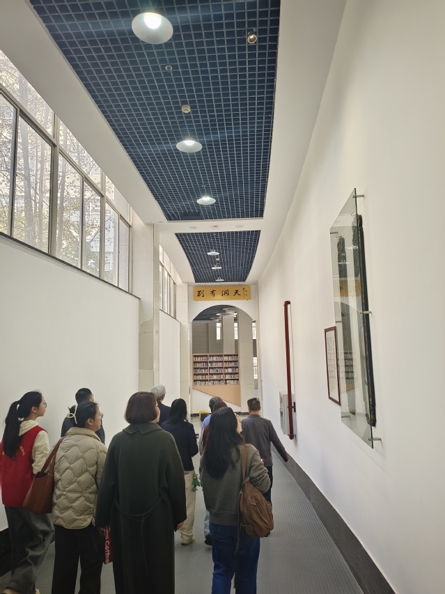 活动伊始,由图书馆馆长薛吉宝、图书馆党委书记周雁军及读者服务部周静老师带领大家参观了“新空间”改造场馆,为老师们详细介绍了“新空间”改造升级后的场馆功能、配套设施及预约方法。老师们依次参观了“云憩台”(发呆区)、“栖心苑”(传统文化活动空间)、“通观堂”(珞格智慧学习空间)、“致知阁”(研学空间)、“上岸坡”(匾牌文化走廊)、“浩然堂”(多功能文化空间)、水云榭(临水长廊,生态校园文明行为示范区)等“新空间”改造场馆。历史与文化的交融、多元的现代化设施以及舒适温馨的研学环境令人眼前一亮,无论是“云憩台” 的闲适氛围、“通观堂” 的智慧学习体验、“浩然堂” 多功能性还是水云榭的生态之美,都为师生提供了良好的学习和研究环境,让老师们赞不绝口。