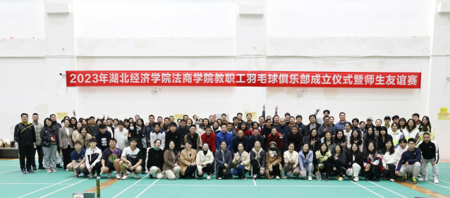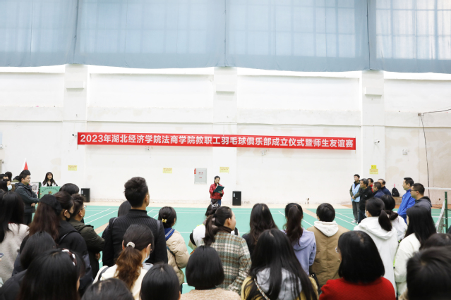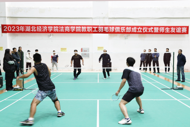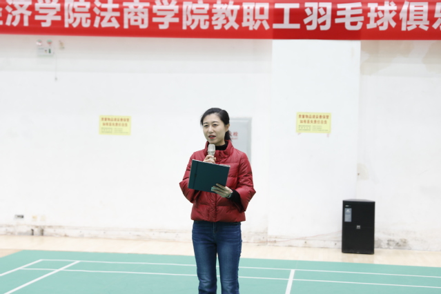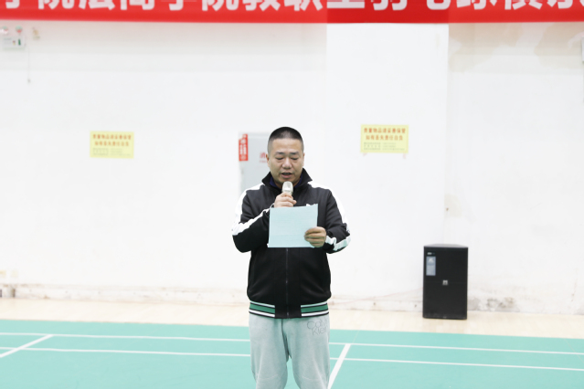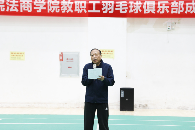 党委书记邓志华致辞,他代表学院向羽毛球师生联谊赛的开幕表示热烈祝贺。他表示,羽毛球项目是学院教职工的一张响亮名片,在第十九届体育运动会暨第四届“教工杯”羽毛球团体比赛中,学院教职工团队一举夺魁,获得冠军。卓越成就的背后是学院师生良好的体育素养,也是“法商精神”的最好体现。他希望,更多的“法商人”参与到体育运动中来,共享运动的快乐,为学院发展贡献力量。最后,他宣布教职工羽毛球俱乐部正式成立。