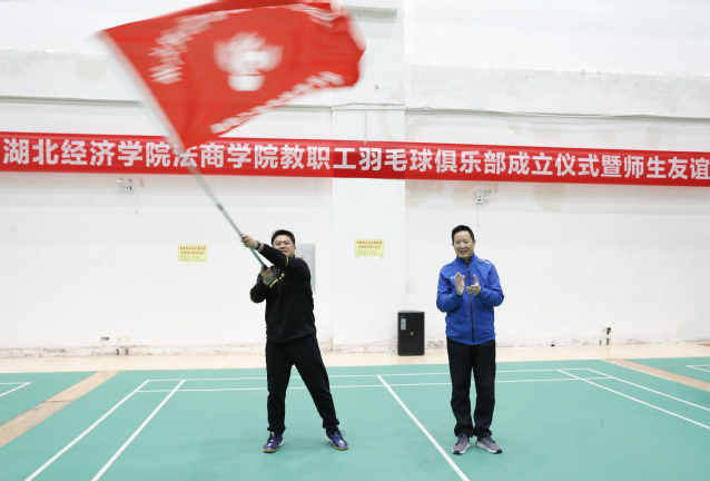 党委副书记、副院长杨宏斌为教职工羽毛球俱乐部授旗,教练员马华强接旗