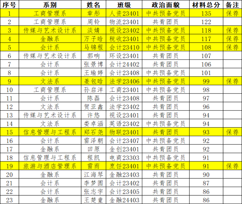 根据《关于开展2025年度五四先进集体、优秀个人评选工作的通知》,各系团总支在系党总支的指导下严格执行评选标准和程序,推荐了一批优秀学生参与2025年度“五四红旗标兵”评选。经院团委资格审查和材料复审,各系材料分第一名为保荐人员,共7人,需进行现场展示。其余人员根据剩余评选名额(8人)按1:2比例从高分往低分推选16人进入现场答辩评审,拟定入围答辩评审展示人员名单如下: