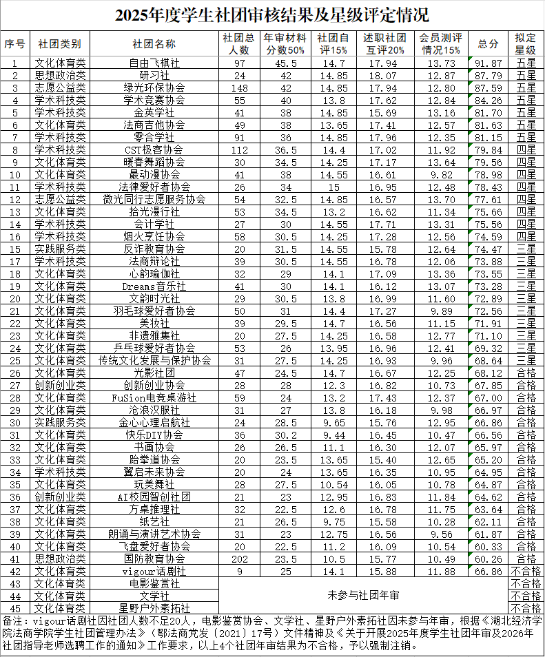 为进一步加强我院学生社团管理,明确责权,规范运作,激发我院学生社团活力,推动学生社团健康有序地发展,发挥学生社团在我院校园文化建设中的作用,促进校园精神文明建设,推进学生素质教育,引导各学生社团积极开展方向正确、健康向上、格调高雅、形式多样的社团活动,促进学生德智体美劳全面发展。根据《开云·体育-中国一站式服务平台学生社团管理办法》(鄂法商党发﹝2021﹞17号)要求,对2025年度学生社团工作进行了考核评价。本次考核于3月5日正式启动,3月17日完成各类材料审核与评分,3月22日组织召开学生社团述职评议会,并开展会员测评,现考核工作已基本完成。经社团管理中心初审、院团委复审报学生社团建设管理评议委员会审议,现将2025年度学生社团年审结果公示如下: