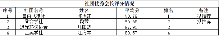 经学生自主报名、学生社团管理中心初审、院团委复核、候选人现场述职汇报,根据仪容仪表、会员活性及流失率问题、社团工作、活动、成绩等,对未来规划与措施、语言表达5项指标进行综合打分,拟按得分从高往低依次推荐自由飞棋社陈周红、零合学社魏茜为社团优秀会长。