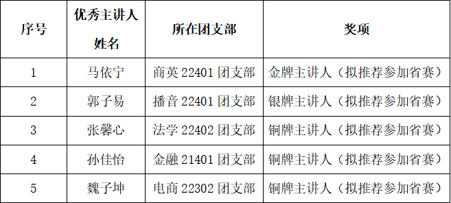 5月10日经院级决赛评选,拟授予马依宁等5名同学“优秀主讲人”荣誉称号并推荐参加省赛。现公示名单如下: