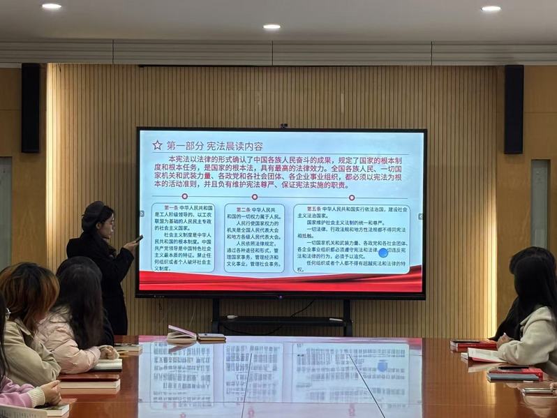 活动开场,徐幸琪带领大家观看了教育部国家宪法日“宪法晨读”直播,随后谭老师详细阐述了新中国成立以来所取得的一系列历史性成就,通过丰富的案例和详实的数据,让大家清晰地感受到宪法在国家发展进程中所发挥的不可或缺的重要作用。与此同时,她借助此次活动的契机,积极鼓励同学们踊跃参与 “宪法卫士”网络学习平台,充分利用线上丰富的学习资源,深入钻研宪法条文,深刻感悟宪法精神,促知识入脑入心。