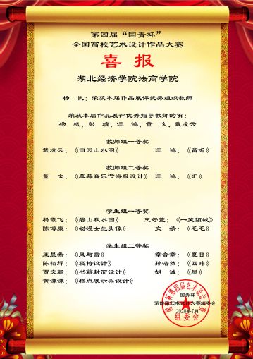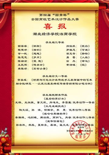 本网讯(通讯员 张东)近日,第四届“国青杯”全国高校艺术与设计作品展评获奖名单揭晓,我院传媒与艺术设计系参赛作品斩获33项奖项,其中教师组一等奖2项,二等奖2项;学生组一等奖6项,二等奖9项,三等奖14项;杨帆老师获作品展评优秀组织教师,杨帆等五位老师获作品展评优秀指导教师。