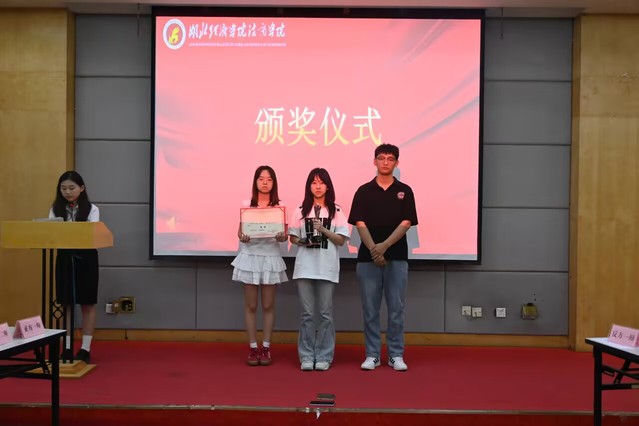 院学生会主席张骞为文法系辩论队颁发季军奖杯