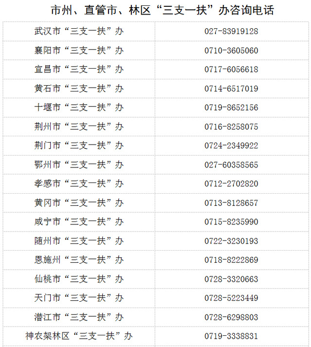 报考人员可于4月21日起登录湖北省人事考试网(https://rst.hubei.gov.cn/hbrsksw/)查询。各地各服务岗位的具体招募计划及岗位要求等详见《2025年度湖北省“三支一扶”高校毕业生招募选派计划表》。有关事项咨询可直接与相关市州“三支一扶”办联系(联系方式附后)。