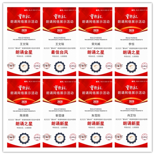本网讯(通讯员 黄琪琪)近日,第六届“曹灿杯”全国青少年朗诵大赛以线上方式举行。我院传媒与艺术设计系9名师生参加国赛,8人获奖,其中王文瑞获朗诵金星奖及最佳台风奖,荣刘威、李恒、陈黛萌获朗诵之星奖,靳雯捷(指导老师)、朱雪阳、肖芷怡获朗诵新星奖。