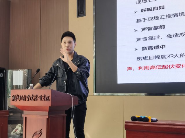 会议伊始,周瑞老师以教学创新、精彩呈现-现场汇报的实战技巧为主题,从评分索引、表达方式、服化设计、情境还原四个维度进行讲解现场汇报的相关注意事项。他谈到“现场汇报是对教学设计过程与教学成效的整体传播,在教学竞赛的特殊传播背景里,透过文字还原事实,明确汇报的目的和针对性。”周瑞结合自身参赛经历,分享了现场汇报的情境演练的重要性、教师职业的有声语言表达技巧以及现场汇报的文稿撰写与实际表达运用,给老师们提出了诸多的宝贵经验。