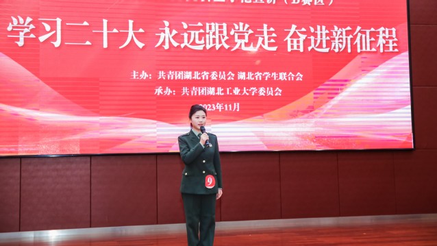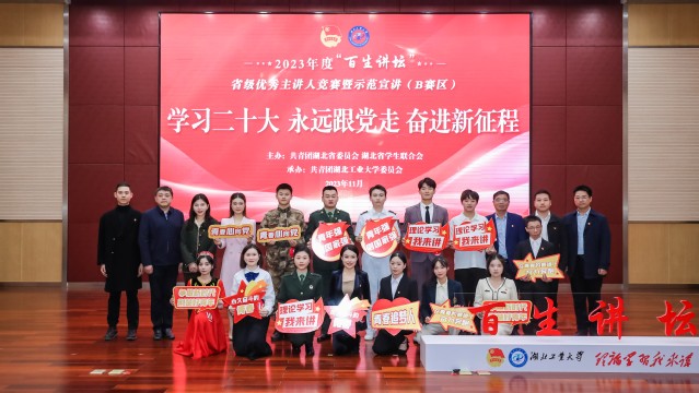 11月9日下午,2023年度“百生讲坛”省级优秀主讲人竞赛暨示范宣讲(B赛区)在湖北工业大学图书馆报告厅举行。来自11所高校的14位主讲人围绕“学习二十大 永远跟党走 奋进新征程”的赛事主题,结合学习习近平新时代中国特色社会主义思想的感悟体会,用青春话语讲述家国情怀和责任担当,引领团员青年在青春的赛道上奋力奔跑。