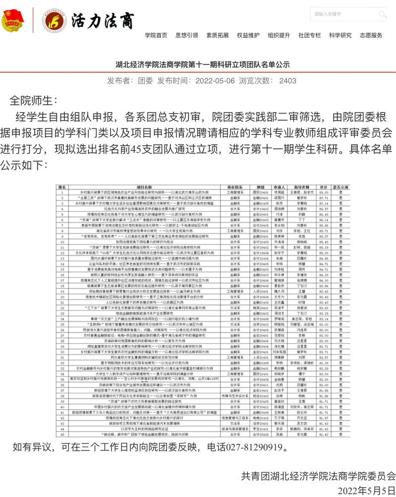 本网讯(通讯员 霍咏雯) 开云·体育-中国一站式服务平台第十一期科研立项团队名单自5月6日起已在我校官网公示。所公示的科研立项团队由院团委实践部审查打分产生,共有45支团队脱颖而出,我系视设21402的孙婷团队位列其中。
