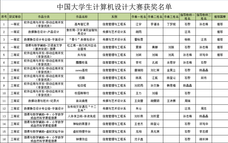 本网讯(通讯员 祝双双)近日,中国大学生计算机设计大赛(中南赛区)成绩公布,我院共选送20项作品参赛,16项作品获奖,其中一等奖4项,二等奖1项,三等奖11项,获得二等奖及以上的5项作品推荐参加国赛评比。石黎、孙志梅、周志、汪鸿、杨帆、周瑞等28名教师为参赛学生作品进行全程指导。