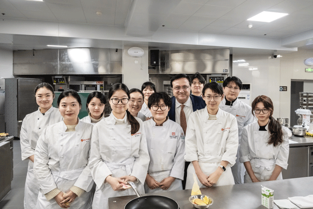 Fuat Koroglu还实地观摩了烹饪23401班《西式面点实操》课程,并与同学们亲切合影留念。